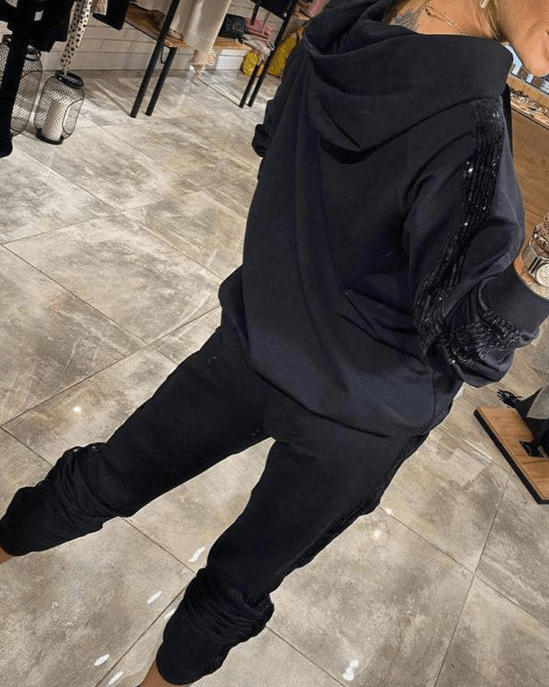 - Fashionable sequin details – The shimmering panels along the sleeves and pants elegantly catch the light, adding a touch of understated glamour to your everyday look.